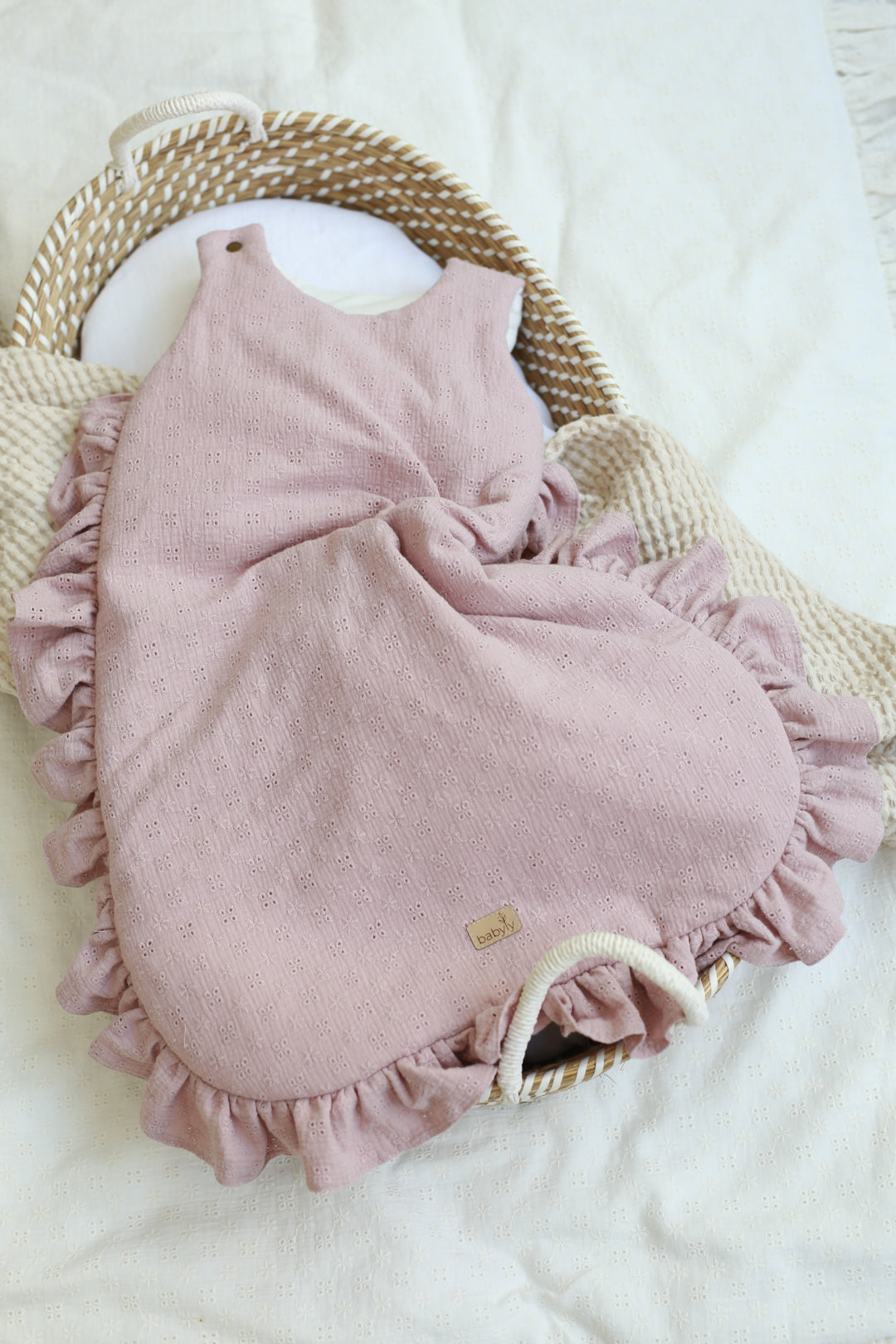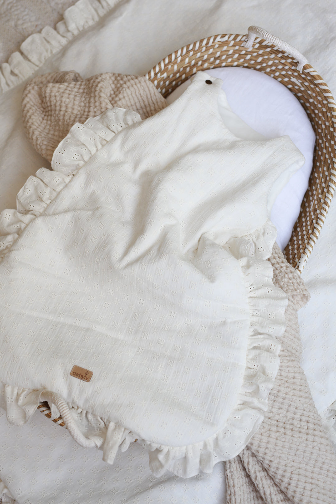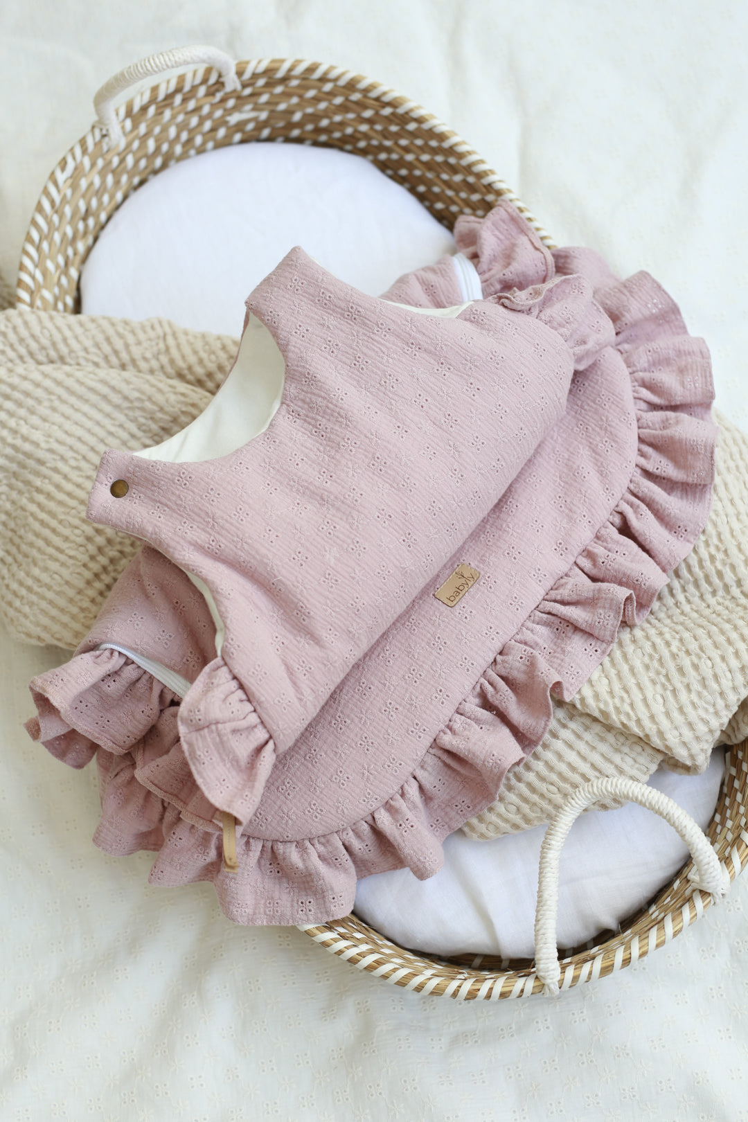 Om het verschonen van de slapende baby gemakkelijker te maken, hebben we de slaapzak uitgerust met een rits in ¾ van de omtrek van de slaapzak. Het is gemakkelijk om je peuter los te maken en vast te maken. Op een van de armen heeft de babyslaapzak een drukknoop waardoor het makkelijker is om de baby erin en eruit te halen. De geborduurde slaapzak is gemaakt van hoogwaardig dubbelgaaskatoen met borduursel en zeer zachte stof. Lengte: 70 cm