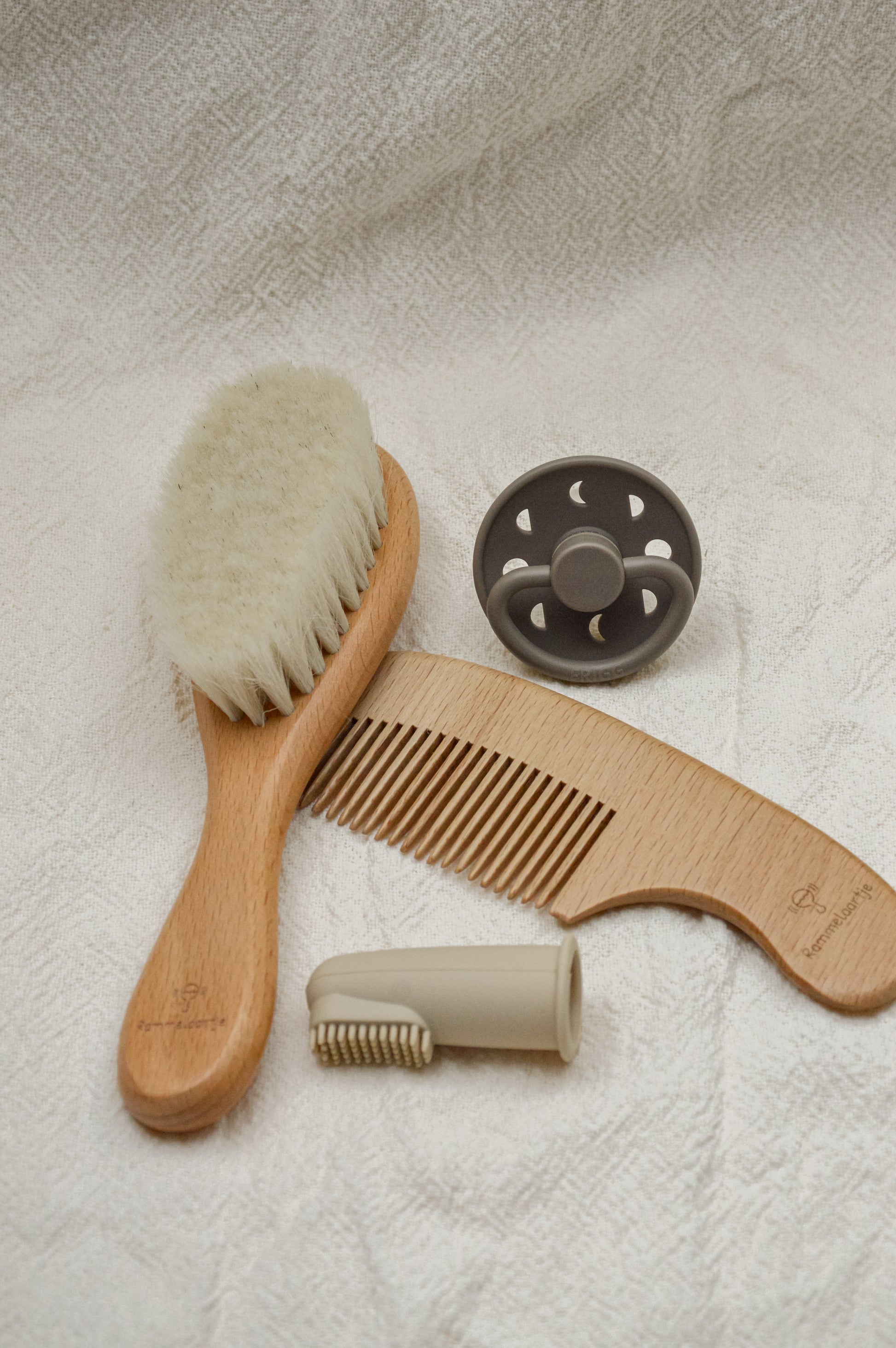 Beukenhouten kam en borstel met zachte haartjes. Speciaal voor babyhaartjes. Kam de fijne haartjes van je kleintje en masseer daardoor direct de hoofdhuid! Deze mooie set is ook leuk om cadeau te geven!
