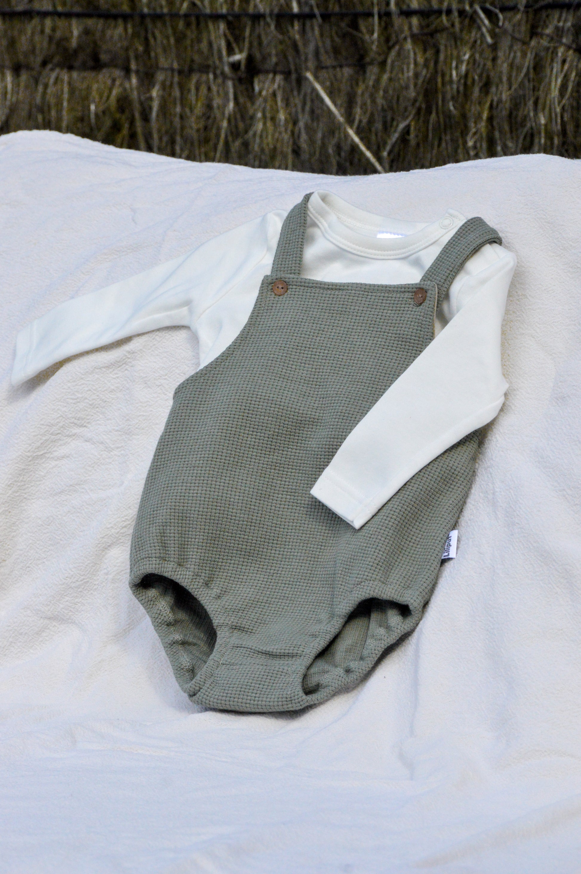Hele zachte en fijne romper. Witte t-shirt en een groen rompertje.